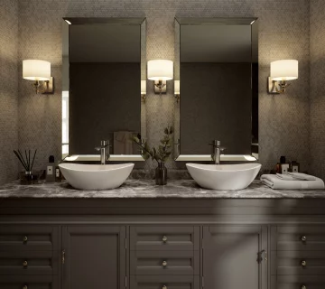 As you map out your bathroom’s lighting scheme, include mood and task lighting alongside standard ambient light; consider a wall art light, plant spotlight, or feature light above the tub or in the shower, too, notes Newhart.